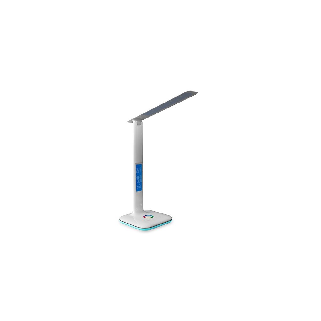 Moderní stolní lampička PANLUX s dotykovým vypínačem a RGB podsvícením Podstavec slouží jako noční přisvícení v libovolných barvách RGB - možnost plynulého přepínání barev Možnost nastavení barvy hlavního světla: 3 režimy svícení (teplá bílá | studená bílá | neutrální) Možnost nastavení intenzity hlavního světla / stmívání Podsvícený display s časem, budíkem, teplotou a datemDoplňkové parametry