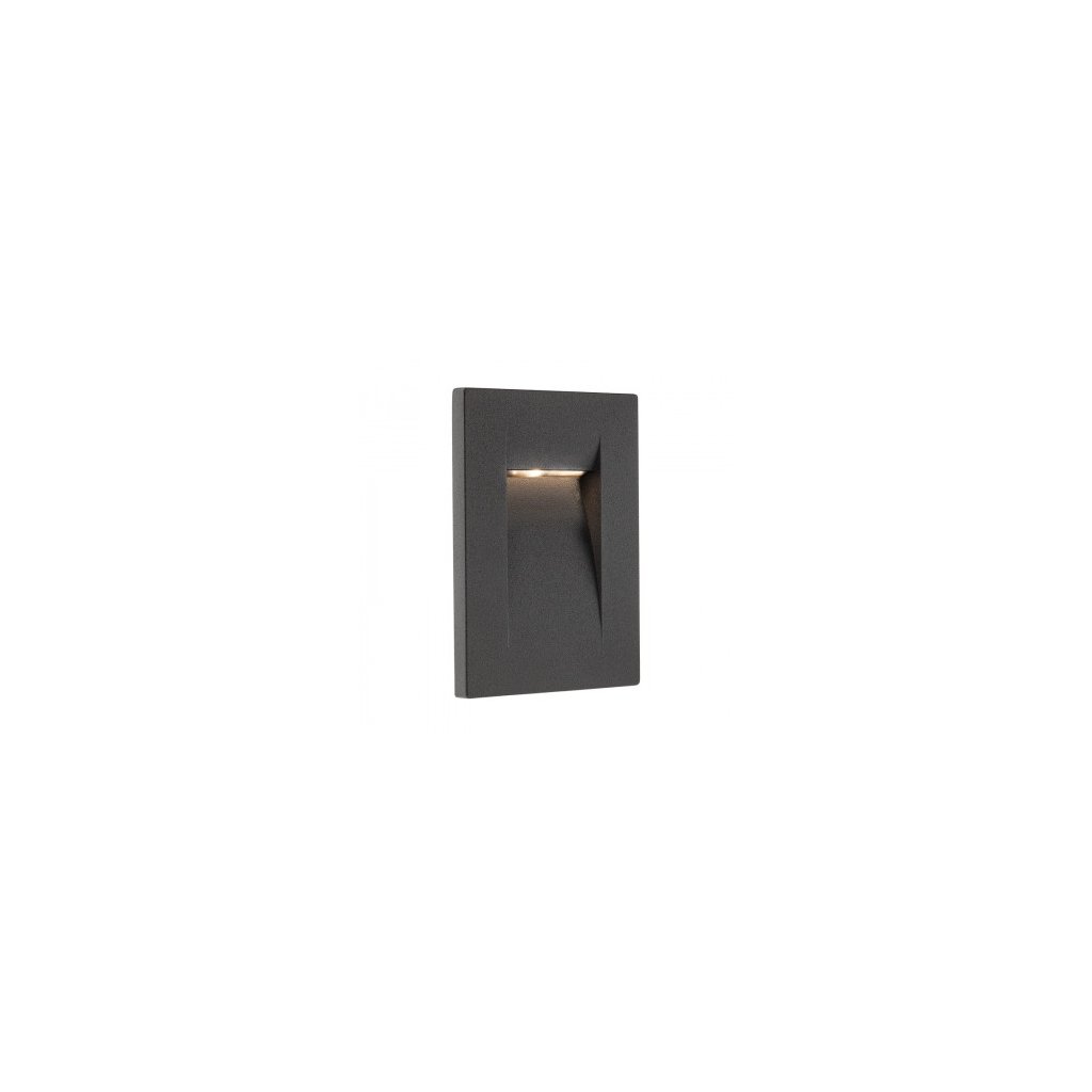 Venkovní nebo interiérové zápustné nástěnné svítidlo s asymetrickým svícením, hliníková slitina tmavě šedé barvy. Obsahuje POWER LED 1x3W teplé bílé barvy, 3000K. Součástí svítidlo je napáječ.Doplňkové parametry